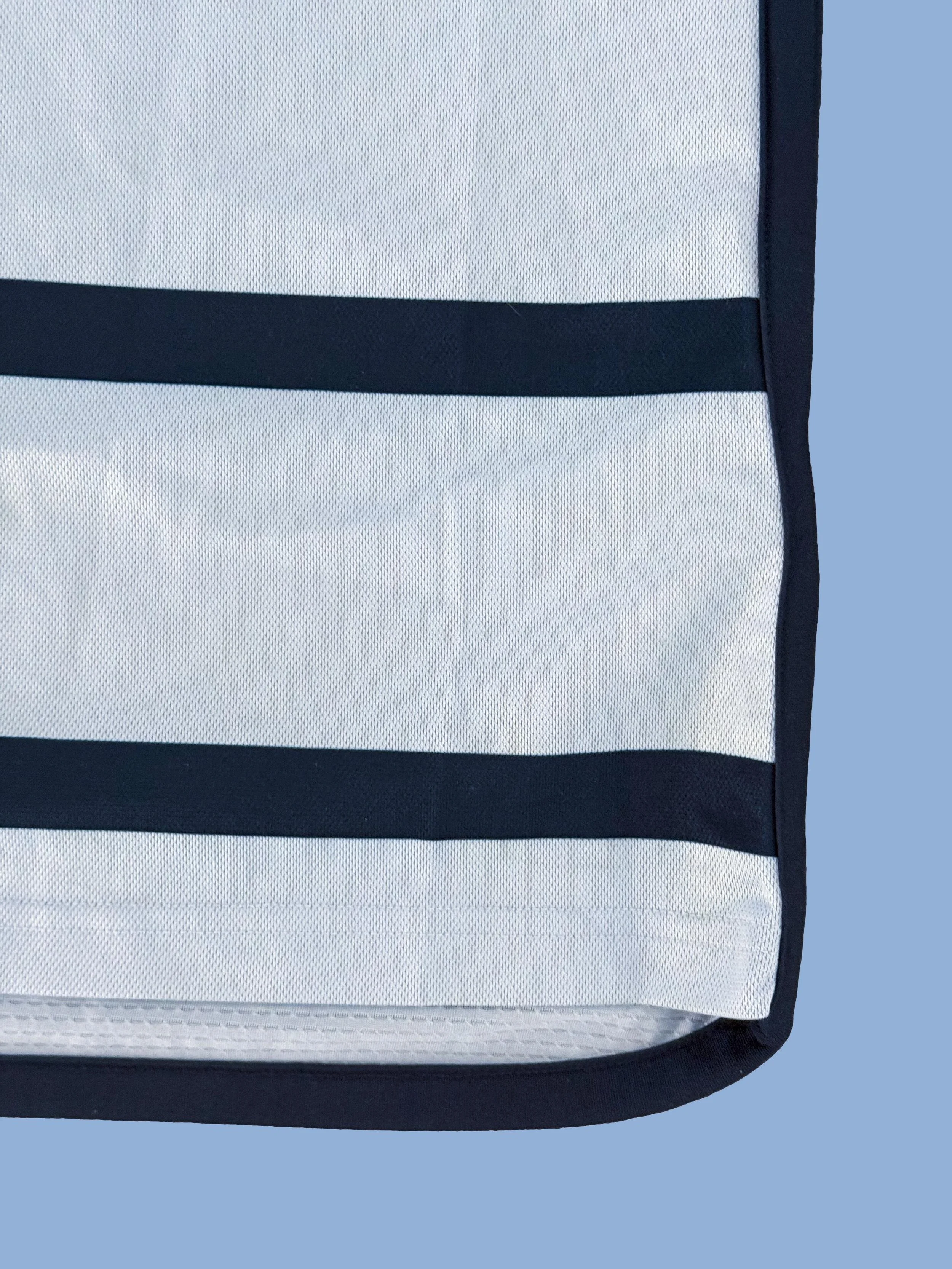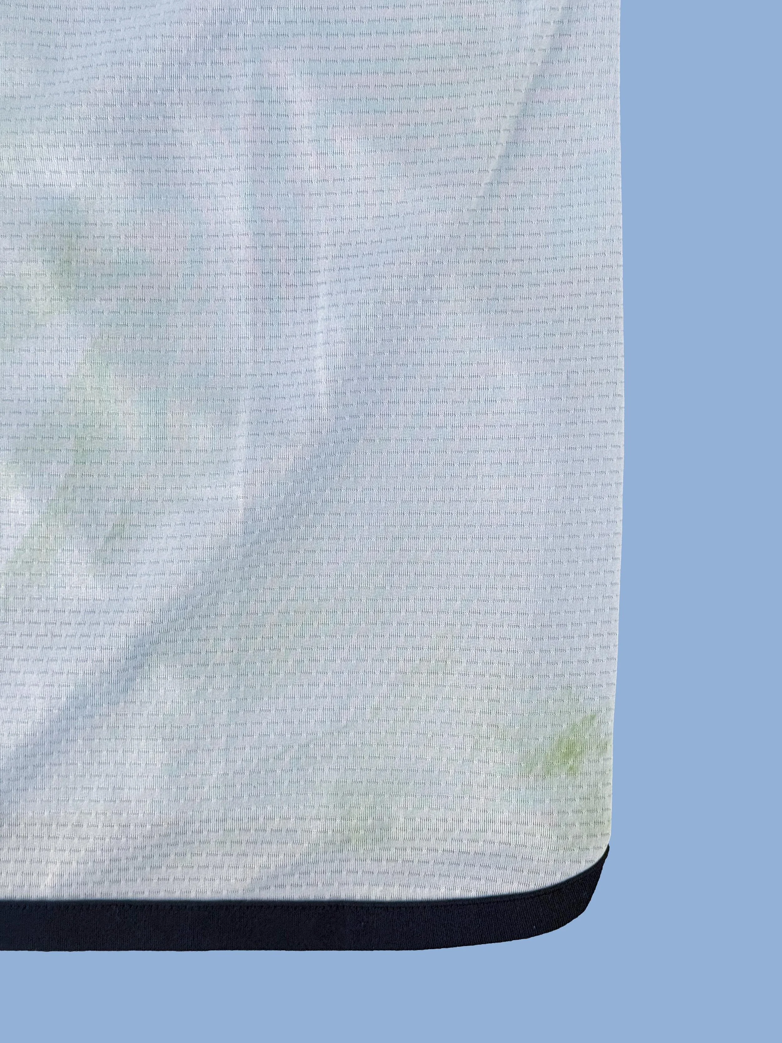 There are dirt and grass stains, as well as some sweat residue visible on the jersey