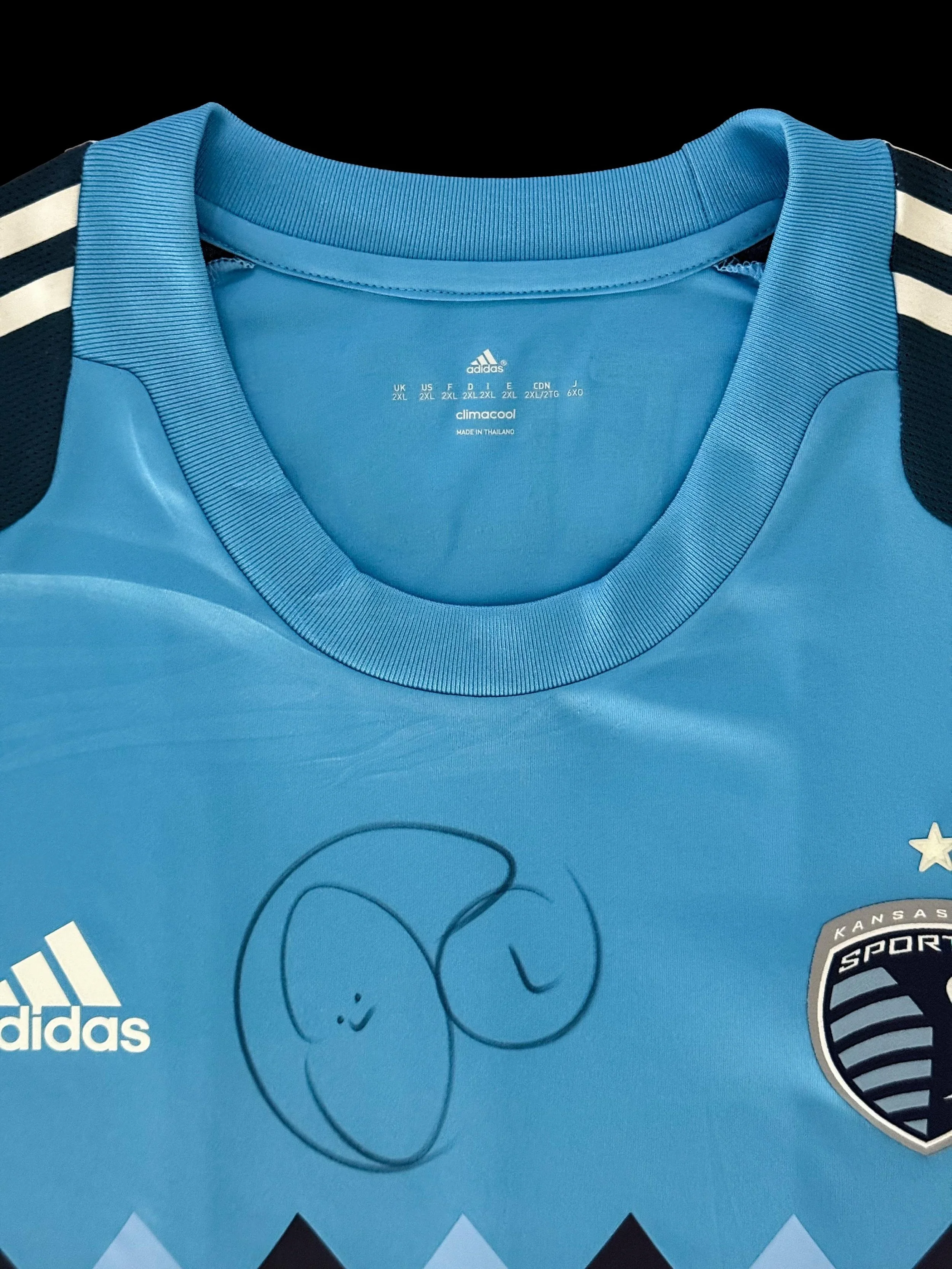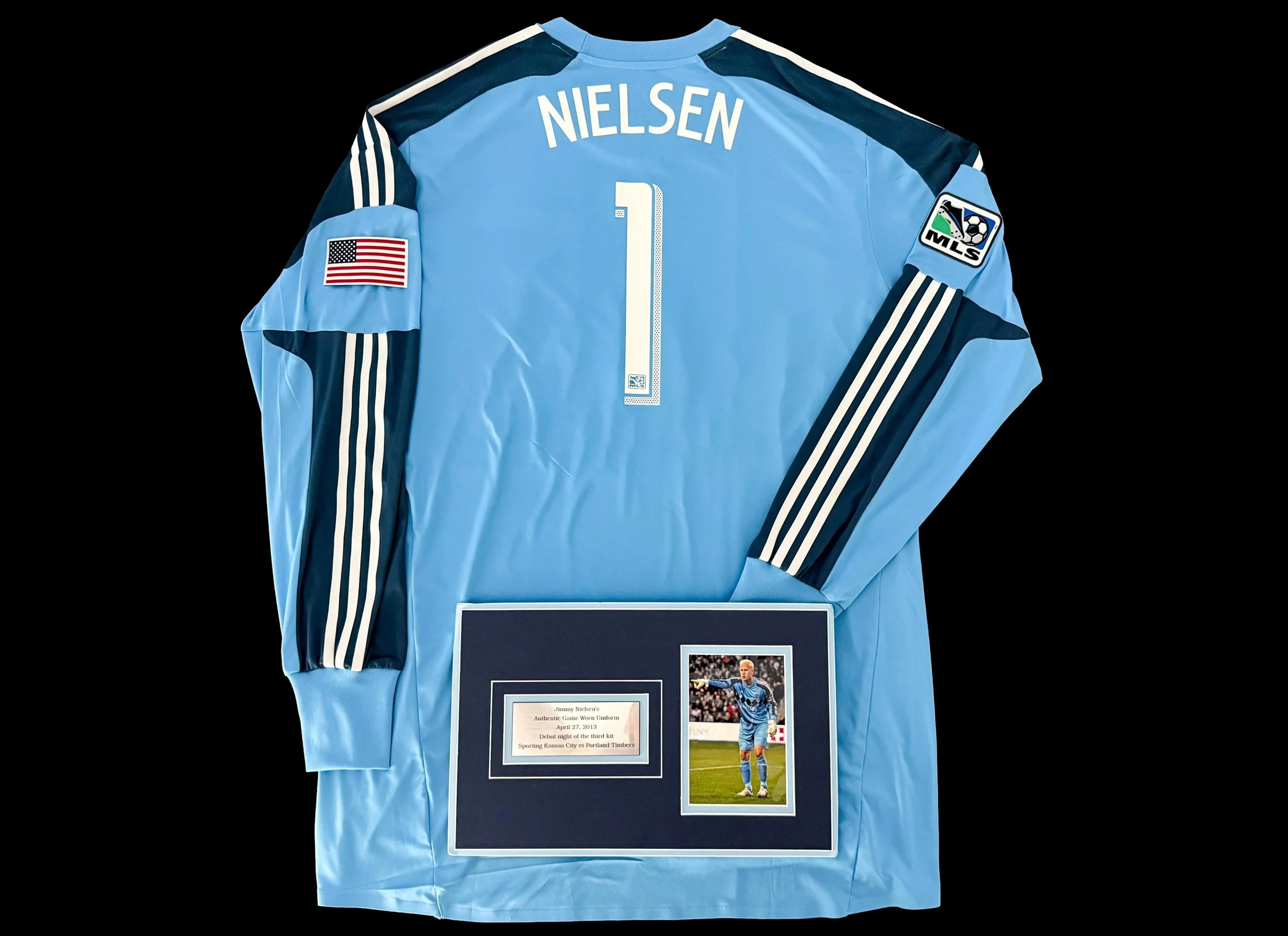 This kit was originally a part of a framed uniform set of Jimmy Nielsen’s that was auctioned by Sporting Kansas City for charity